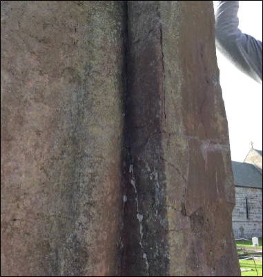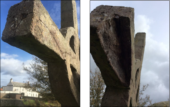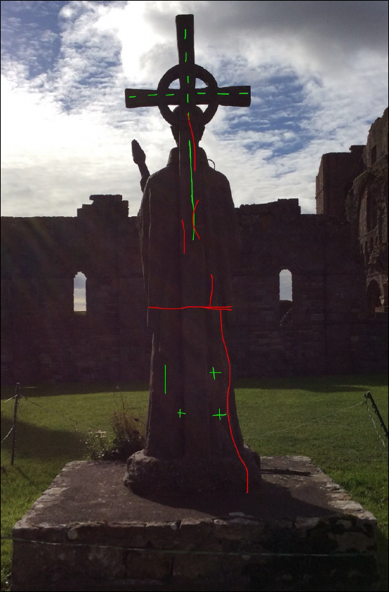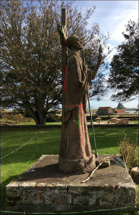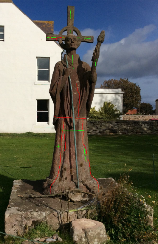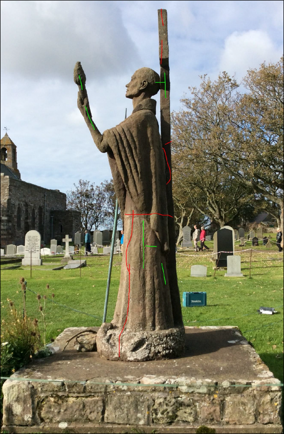 When comparing the present condition of the sculpture to the images taken during the site visit of January 2015 it appears that there has been relatively little deterioration. Structurally in the main the sculpture appears solid. There are a few small areas that appear weak and may need some work but only one main area that appears vulnerable. The main area of vulnerability is midway down the cross at the back of the sculpture where there are numerous cracks as well as previous repairs. There is considerable weight bearing down from the cross above which is most likely the cause. The cross also attaches to the head of St Aidan which is also bearing some weight. There is a slight crack here but structurally it appears to be sound.
