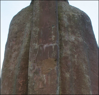 The sculpture appears to have been constructed as two main sections, upper and lower halves. The external surface of the sculpture comprises of a red concrete mixed with coarse sand. A number of failing previous repairs can be seen on the sculpture surface, particularly in the areas where stress cracks are evident. This is most evident at the rear of the sculpture where the cross joins with St Aidan’s back.
